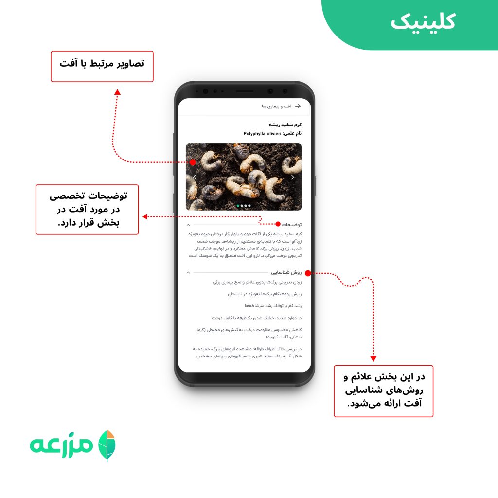 ‌برای مشاهده تصاویر نام علمی و توضیحات و علائم خسارت کرم سفید ریشه می‌توانید به بخش کلینیک سامانه مزرعه مراجعه کنید.